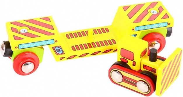 Szórakoztató készlet fa vasútpályákhoz: nehézteher-kocsi mágneses kapcsolókkal, levehető buldózer és két sín. Kompatibilis a legtöbb fa vonatpályával, minőségi természetes anyagokból és fejleszti a képzelőerőt és a finommotorikát, így remek kiegészítője bármelyik vasútnak.