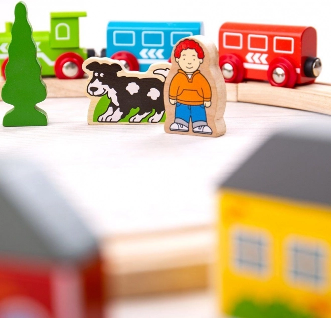 - 19 darabos készlet: 8 sín, 1 mozdony, 2 vagon, 8 kiegészítő (házak, fák, figurák)