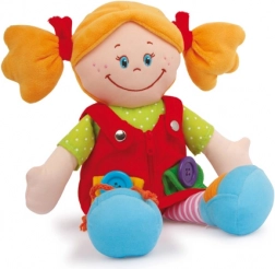 Élénk színek, kellemes anyag és interaktív részletek támogatják a tapintási ingereket és a koncentrációt. A gyerekek a ruhácskán lévő különböző elemek kezelésével gyakorolják a fogást.