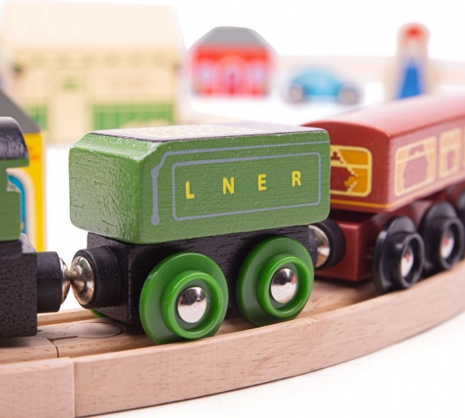 A Flying Scotsman a kora egyik leghíresebb vonata, és ezzel a fa vonatpályával a gyerekek újra átélhetik híres utazásait. A készlet gyönyörűen kidolgozott vonatot tartalmaz, amely nosztalgikus utazásra visz viaduktokon és természeti tájakon át. A pályát retro állomások, házak és autók szegélyezik.