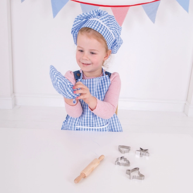 Fiatal szakácsok imádni fogják ezt a világos és kellemesen kék pamut készletet sütéshez és főzéshez. Tartalmaz kötényt, kesztyűt, szakácssapkát, sodrófát és sütikiszúrókat, ideális a szórakoztató főzéshez és szerepjátékhoz.