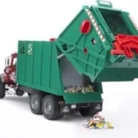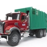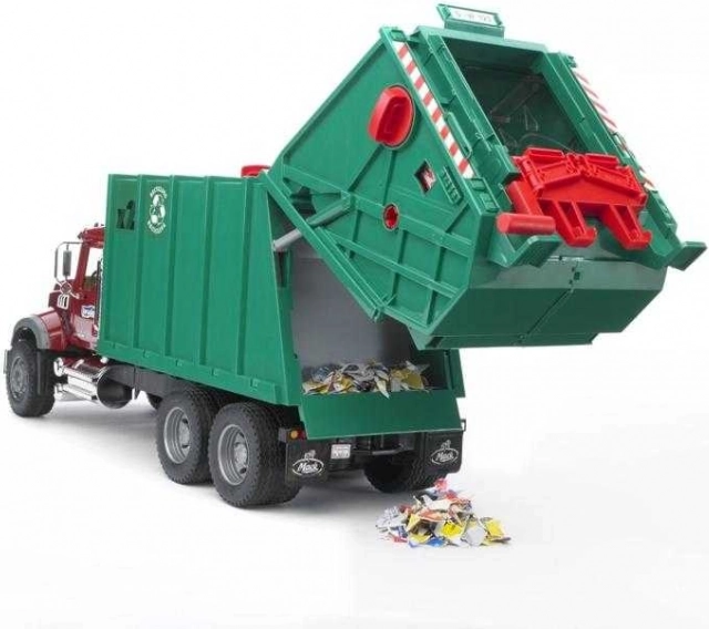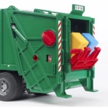 A teljesen működő emelő a szemeteseket a tartályba üríti, ahol a hulladékprés az anyagot a jármű hátsó részébe tolja. Megtelt állapotban a hátsó ajtó kinyitható, és a rakomány kiüríthető. Mindezt kiegészítik a nyitható fülkeajtók, a felnyitható motorháztető betekintéssel a motorra és a lehajtható visszapillantó tükrök. A modell Németországban készült, minőségi műanyagból, és intenzív gyerekjátéknak is ellenáll.