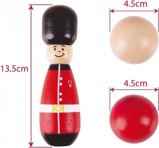 Élvezze a szórakoztató klasszikus teke játékot, ahol a bábuk szeretnek feldőlni és visszaállni. Hat fa tekebábu és egy fa bowling golyó remek eszköz az ügyesség és koordináció fejlesztéséhez. Készlet tartalma: