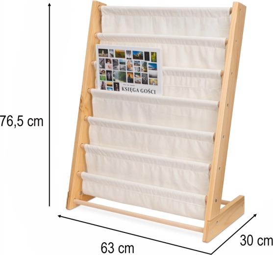A polc természetes fából és minőségi pamutvászonból készül, sima élekkel és stabil szerkezettel a maximális biztonság érdekében. A fa és a fehér szín időtálló kombinációja bármely enteriőrbe beleillik, és támogatja az egészséges olvasási szokásokat és a rend szeretetét.