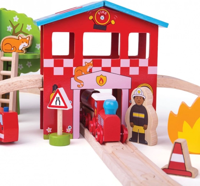 Ez a tűzoltóállomás témájú fa vonatpálya bármely szobát mentőközponttá varázsol. A gyerekek áthaladhatnak a tűzoltószertár alagútján, versenyezhetnek a tűzoltóautóval, útnak indíthatják a mentővonatot levehető vagonokkal, és segíthetnek a tűzoltóknak létrával vagy tűzcsappal. A színes részleteknek és a masszív kivitelnek köszönhetően a játék kiválóan fejleszti a képzelőerőt és helyzetmegoldásra tanít.