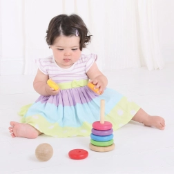 A játék 9 darab, szivárvány színű gyűrűt tartalmaz, amelyek feldobnak minden játékot és segítenek a színek megkülönböztetésében.