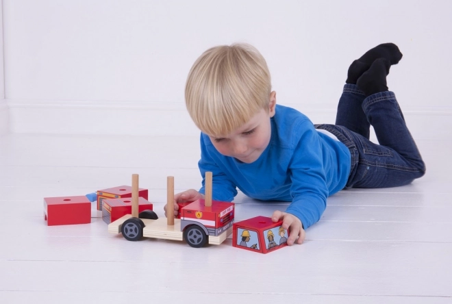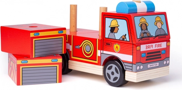 Ez az okos játék ötvözi a szórakozást és a tanulást: a gyerekek fa rudakra rakosgatják az egyes elemeket, fejlesztik a koordinációs készségeket, a formák és színek felismerését, majd a kész tűzoltóautóval izgalmas történeteket játszhatnak el. A masszív fa, a sima élek és a feltűnő színek biztonságos és vonzó játékélményt nyújtanak.