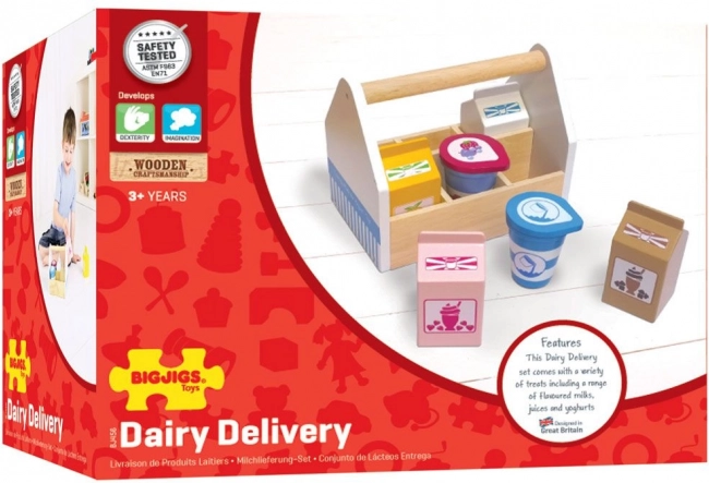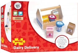 Ez a masszív fa láda négy italos kartont rejt (tej, narancslé, eper- és csokoládéturmix), továbbá egy pohár joghurtot és tejszínt. Ideális kiegészítő a gyerekkonyhába vagy a játékboltba, játékos formában ismerteti meg a gyerekekkel az egészséges táplálkozás alapjait és az élelmiszerek eredetét.