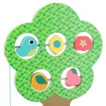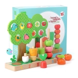 Ez a minőségi fa játék egyesíti a szórakozást és a tanulást. A gyerekek répát, póréhagymát, paradicsomot és más formákat fűznek és raknak az 1–5-ig számozott tüskékre, így természetes módon sajátítják el a számolást, valamint a színek és méretek szerinti válogatást. A készlet része egy kis fa is csúszó elemekkel a felfedezéshez és a szem–kéz koordináció gyakorlásához.