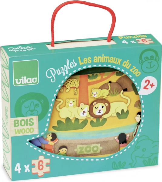 Fa puzzle állatkert motívummal, amely szórakozást nyújt 2 éves kortól. Négy puzzle-t tartalmaz, mindegyik hat darabból áll, és egy praktikus fa dobozban van tárolva pamut fogantyúval.