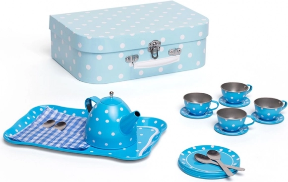 Stílusos kék, pöttyös teaszett masszív bőröndben, amely minden kis vendéglátónak örömet szerez. Tartalmaz mindent a tökéletes gyerek „teadélutánokhoz” – a kannától a csészéken és csészealjakon át. A fém kivitelnek köszönhetően a szett strapabíró, könnyen hordozható és ideális utazáshoz. A játék fejleszti a kreativitást, a fantáziát és a társas készségeket, és megfelel az európai biztonsági szabványoknak.