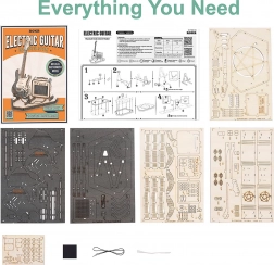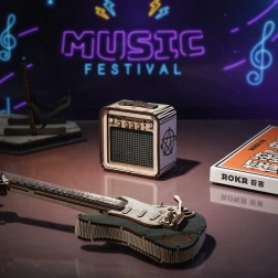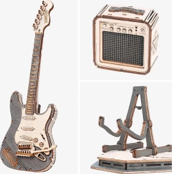 Stílusos fa elektromos gitár kirakó erősítővel zene- és dizájnrajongóknak. Tartalmaz 140 precízen kivágott elemet, alacsony nehézségi szintet és részletes útmutatót a kényelmes összeszereléshez. Ideális asztali vagy polcdísznek.