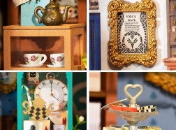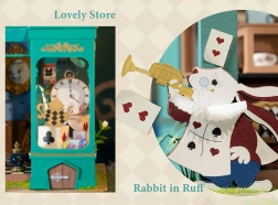 Fedezd fel a fantáziával teli miniatűr világot – a zöld árnyalatokra hangolt teabolt a Fehér Nyúl, a zsebóra és a sakktáblamintás padló motívumaival az európai délutáni tea hangulatát idézi. A LED világítás felkapcsolása után a modell elbűvölő dekorációvá válik kellemes esti atmoszférával.