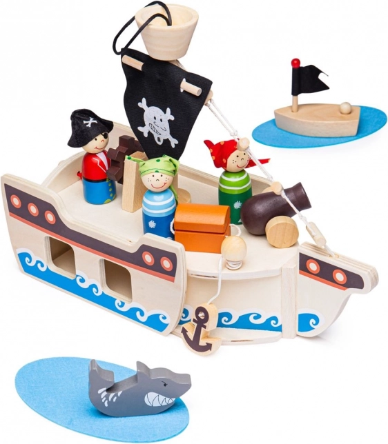 Ez a fa kalózhajó készlet mindent tartalmaz, amire a kis kalózoknak szükségük van a kalandjaikhoz. A csomag tartalmaz egy kapitányt, két kalózt, egy hajót, horgonyt, egy kincsesládát és egy cápát. Az összes játék elem praktikusan elhelyezhető a hajóban, így ideális utazáshoz és könnyű szállításhoz.