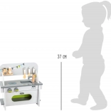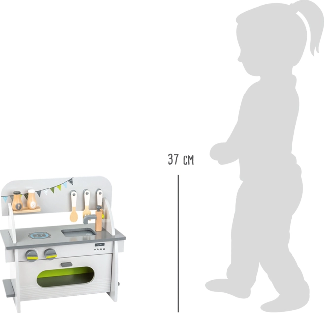 Ez a stílusos és strapabíró, kompakt gyerek konyha ideális a kisebb szobákba. Valósághű elemekkel támogatja a kreativitást, a finommotorikát és a szerepjátékokat. A forgatható gombok kellemes kattogó hangot adnak, a sütő mágneses ajtaja pedig könnyen nyílik és záródik.