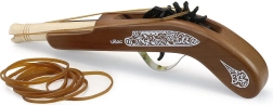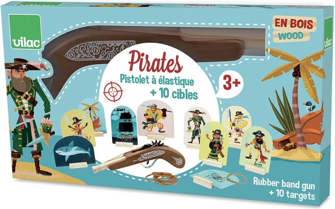 Fa kalózpisztoly a Vilac márkától ideális játék a kalóz kalandokat kedvelő gyerekek számára. Lehetővé teszi a gyerekek számára, hogy célba lövést gyakoroljanak biztonságos gumiszalagokkal, amelyek a csomag részét képezik.