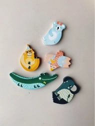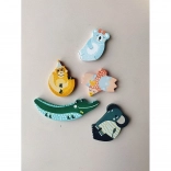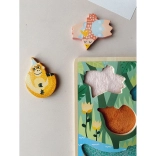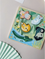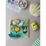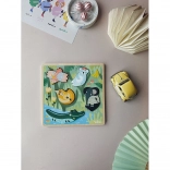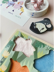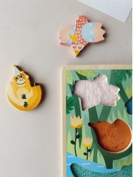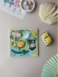 Michelle Carlslund finom pasztellszínekkel készült dizájnja vonzó megjelenést kölcsönöz a játéknak és ösztönzi a képzeletet. A kivágásokkal és állatmotívumokkal ellátott fa alap segíti a formák párosítását, a színek és az állatok felismerését. A kirakó tartós, biztonságos, minőségi fából és textilből készült.