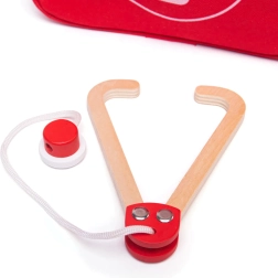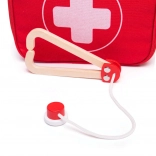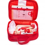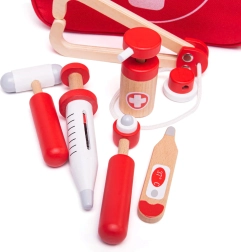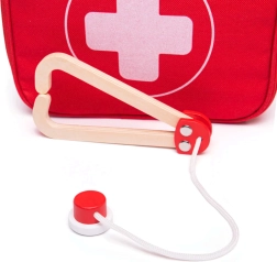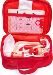 Hordozható orvosi táska kis doktoroknak, 10 gondosan kidolgozott fa és textil eszközzel. Támogatja a kreatív és ötletes játékot, tanít gondoskodásra és empátiára, és a praktikus cipzáras táskának köszönhetően utazáshoz is ideális. Minőségi és biztonságos anyagokból készült, 3 éves kortól ajánlott.