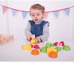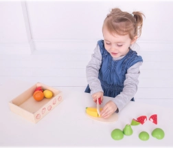 Ez a gondosan kidolgozott készlet a kedvelt gyümölcsfajtákat tartalmazza – alma, körte, narancs, citrom, eper, banán és dinnye – valamint fa kést és vágódeszkát. Az egyes gyümölcsök több részre vannak osztva, amelyeket a „szeletelés” során biztonságosan szét lehet választani, majd újra összeilleszteni. A minőségi faanyag, a sima élek és a tartós kivitel kényelmes és biztonságos játékot biztosít.
