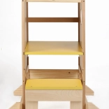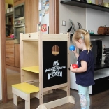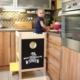 A bükk- és fenyőfa kombinációjából készült többfunkciós tanulótorony segít a gyerekeknek biztonságosan elérni a konyhapultot vagy az asztalt, és bekapcsolódni a közös tevékenységekbe. Két magassági pozíciójának és átgondolt kialakításának köszönhetően támogatja az önállóságot, a motorikus készségek fejlődését és a mindennapi tevékenységek biztonságát. Könnyedén átalakítható asztalkává székkel vagy krétás rajztáblává – ideális tanuláshoz és játékhoz is.