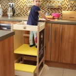 Ez a masszív tanulótorony praktikus segítőtárs minden kisgyermekes háztartásban. Lehetővé teszi, hogy a gyerekek a munkalap szintjén legyenek, jobban lássák, mit csinál, és biztonságosan bekapcsolódjanak a főzésbe, sütésbe vagy kézműveskedésbe. A bükk- és fenyőfából készült tartós fa szerkezet stabilitást és hosszú élettartamot biztosít.