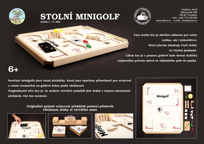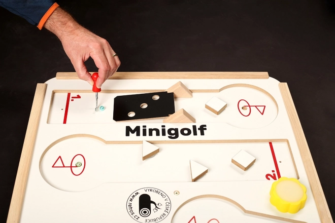 Az asztali minigolf eredeti szórakozást nyújt gyerekeknek és felnőtteknek egyaránt. A négy pálya tapadókorongos akadályai tetszőleges elrendezést és végtelen számú kombinációt tesznek lehetővé. Minden játék más, fejleszti a megfigyelőképességet, a türelmet és a finommotorikát. Masszív anyagainak köszönhetően ideális a gyakori játékhoz otthon és iskolákban.