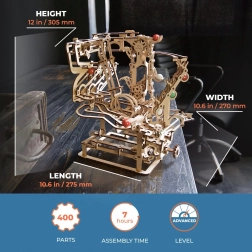 Ez a kidolgozott, minőségi rétegelt lemezből készült golyópálya a makettezés örömét, az oktatási értéket és a megnyugtató látványt ötvözi. A kézzel hajtott láncos felvonó egyenletesen juttatja a golyókat a startpontra, ahonnan három különálló szekción haladnak tovább, mindegyik egyedi fő akadállyal. A nyitott dizájn kiemeli a működő mechanikát és a finom részleteket.