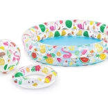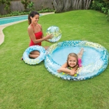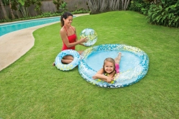 A készlet tartalmaz felfújható medencét, úszógumit és strandlabdát – a gyerekek pancsolhatnak, labdázhatnak és magabiztosabban mozoghatnak a vízben.