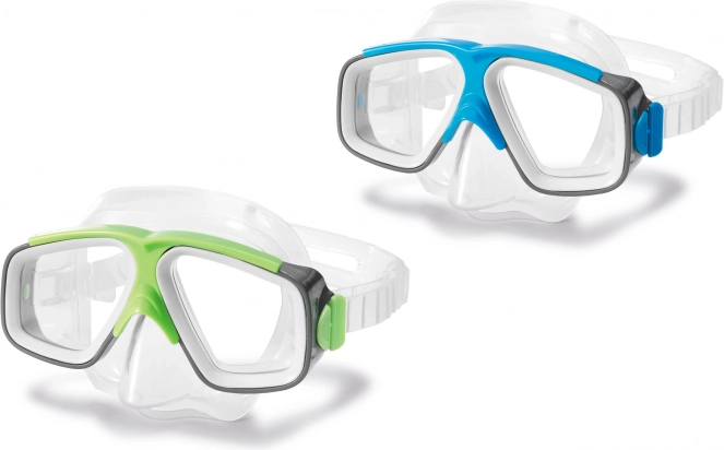 Gyermek búvárszemüveg kényelmes és biztonságos víz alatti kalandokhoz. Állítható pánttal, 8 éves kortól ajánlott.