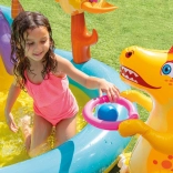 A vidám Intex Dinoland vízi játszótér nyári szórakozással tölti meg a kertet. A gyerekek lecsúszhatnak a felfújható csúszdán a pancsolóba, lehűthetik magukat a vízi szökőkút alatt, és játszhatnak a felfújható dínóval, amelyen bedobó kosár is található. A puha landoló alátét növeli a kényelmet és a biztonságot a mókázás közben.