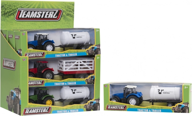 Válassz traktort zöld, kék vagy piros színben, és csatlakoztasd a kedved szerint a pótkocsit – univerzális platóst vagy stílusos tejtartályost (elérhetőségtől függően).
