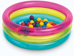 Vidám, labdákkal teli felfújható játszómedence a INTEX márkától, amely bármely gyerekszobát vagy kertet biztonságos játszótérré varázsol. Átlátszó falak rózsaszín, sárga és kék csíkkal. A tartós PVC könnyű karbantartást és hosszú élettartamot biztosít, ideális 1–3 éves gyermekek számára.