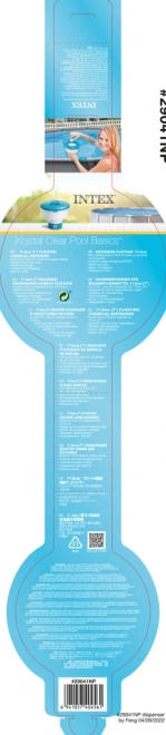 Az Intex úszó adagoló szabadon lebeg a víz felszínén, és nagy mérete biztosítja a láthatóságot és a biztonságot. Tartós polipropilénből készült, és biztonságos fedéllel van ellátva, amely képes klór- vagy brómtablettákat befogadni, legfeljebb 7,5 cm-es méretig.
