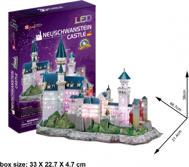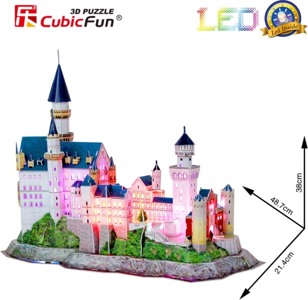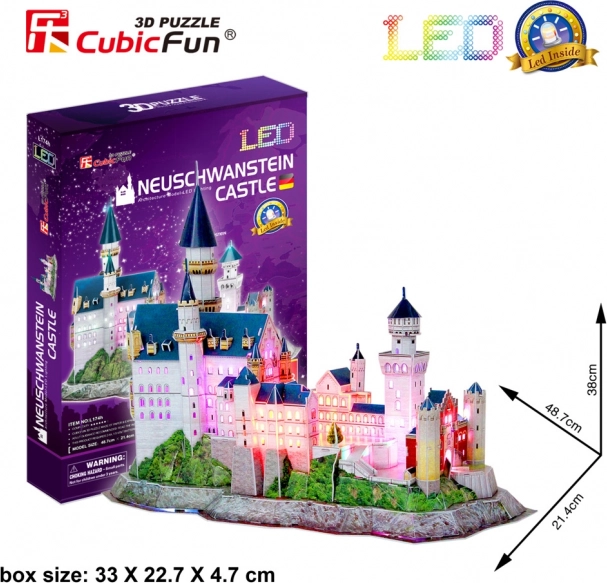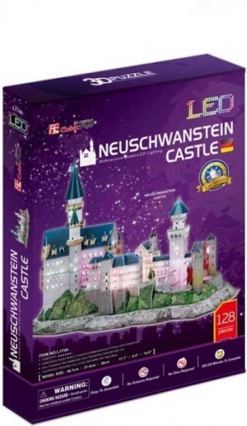 Fedezze fel a romantikus építészet varázsát a Neuschwanstein kastély részletes 3D modelljével. A LED háttérvilágításnak köszönhetően a modell nappal és éjjel egyaránt kitűnik, és bármely helyiség díszévé válik. A készlet kényelmesen, ragasztó és olló használata nélkül állítható össze – a perforált elemeket elég kitörni, majd követni az útmutatót.
