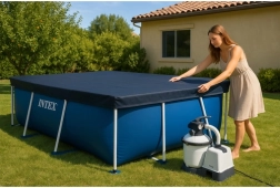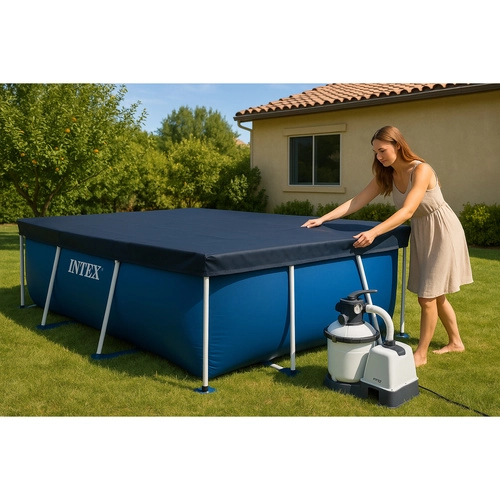 Az INTEX takarót a 300 × 200 cm-es téglalap alakú vázas medencékhez tervezték. Tartós anyagának köszönhetően ellenáll az időjárásnak, és megóvja a vizet a levelektől, rovaroktól és szennyeződésektől. A kb. 20 cm-es ráhagyás és a rögzítő zsinór stabil rögzítést biztosít, hogy a takaró ne csússzon le.