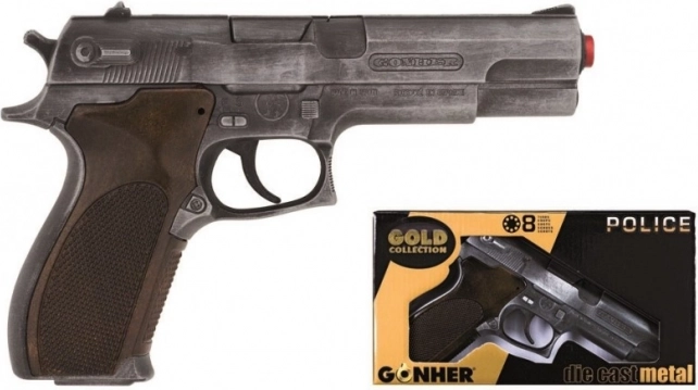 Ez a Gold Edition rendőrségi pisztoly valósághű dizájnjával, masszív fém szerkezetével és megbízható mechanikájával tűnik ki a 8 lövetű kapszulákhoz. Kompakt méreteinek köszönhetően kényelmes a fogása, ideális szórakoztató játékhoz és tematikus jelmezekhez.