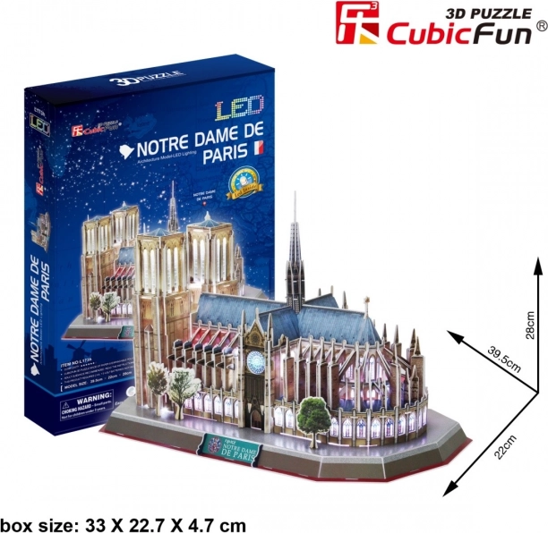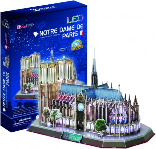 Fedezze fel a francia gótikus építészet varázsát a 3D puzzle Notre-Dame-katedrálissal. Ez a készlet LED világítást és minőségi kivitelezést kínál ragasztó használata nélkül.