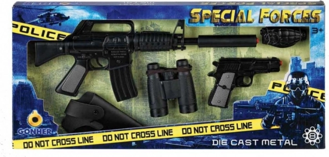 A készlet tartalma:Az összes elem gondos, fém kivitele hosszú élettartamot és tartósságot biztosít játék közben. Ez a kapszulás készlet ideális ajándék a kis rendőröknek, akik igazi különleges egységként szeretnének akcióba lendülni. Spanyolországban készült.