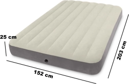 Kétszemélyes INTEX felfújható matrac 203 × 152 × 25 cm méretben, otthonra és kempingezéshez egyaránt remek. Kellemes velúr felülettel, gyors Boston szeleppel az egyszerű felfújáshoz és leeresztéshez, valamint belső Dura-Beam Fiber technológiával a jobb testtámaszért. A csomag része egy javítófolt is.