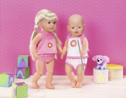 Kényelmes babaalsó szett 38–46 cm-es babákhoz, amely puha anyagokkal, vidám mintákkal és könnyű felöltöztetéssel örvendeztet. A csomag része egy trikó és bugyi, tökéletesen összehangolva a stílusos játékhoz.