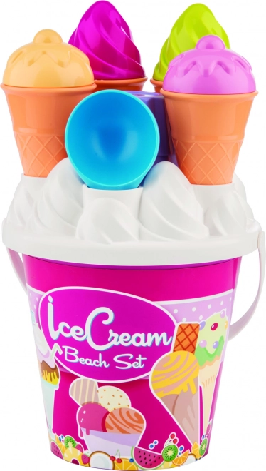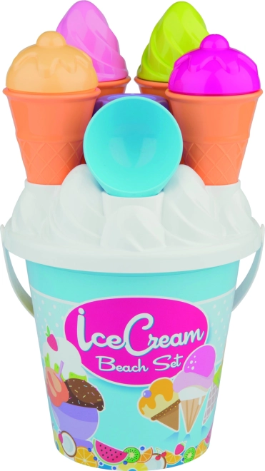 Műanyag homokozó készlet fagylalt motívummal, amely végtelen szórakozást kínál a gyerekeknek a strandon vagy a homokozóban.