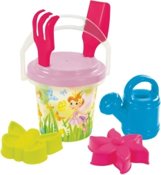 Minden egy helyen: 1,3 l-es vödör, gereblye, lapát, szita, locsolókanna és két forma az egyszerű alakításhoz és várépítéshez.