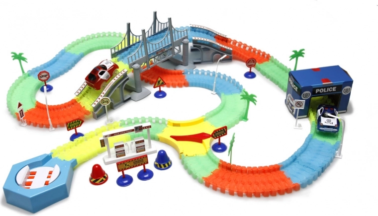 Fedezd fel a határtalan szórakozást a világító, rugalmas pályával 220 elemmel és LED-es kisautóval! A pálya könnyen összerakható, formálható és átalakítható, a kisautó menet közben világít, látványos fénycsíkokat hagyva maga után. A készletben híd, rendőrőrs és benzinkút is található, hogy még több játéklehetőséget adjon. Remek választás azoknak a gyerekeknek, akik szeretik az akciót és a fényeket – fejleszti a képzelőerőt és a finommotorikát. Működéséhez 2× AA elem szükséges (nem tartozék).