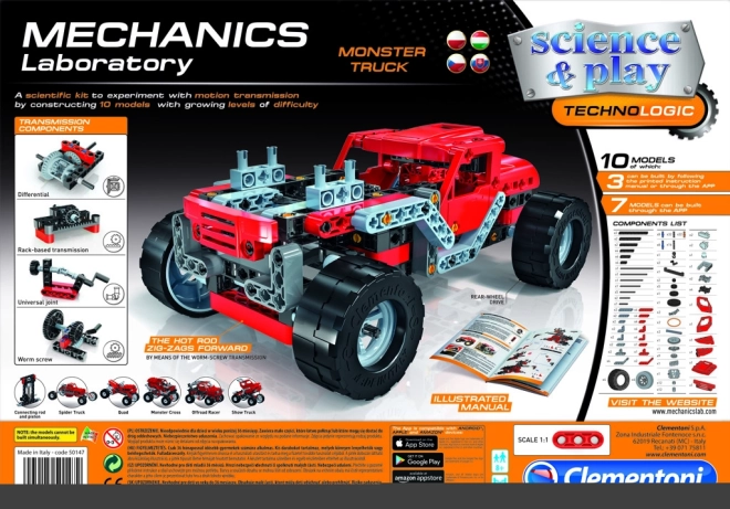A Mechanikai labor Monster Truck készlet ideális a technika és a gépészet fiatal rajongóinak. A dobozban több mint 200 alkatrész található, köztük differenciálmű, fogasléces kormányzás és kardáncsukló. Ezzel a készlettel a gyerekek felfedeznek és alkotnak 10 fantasztikus Monster Truck modellt, miközben elsajátítják a mechanika alapjait.