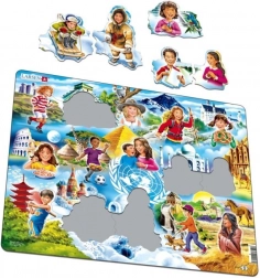 Szórakoztató és oktató puzzle a világ különböző tájairól származó gyerekek motívumával, amely örömet szerez a kis felfedezőknek. A 15 szabálytalan alakú darabnak és a masszív keretes alátétnek köszönhetően a kezdőknek is könnyű kirakni. Minden darab egyedi, a képek grafikailag figyelemfelkeltőek, és fejlesztik a finommotorikát, a logikus gondolkodást és a különböző kultúrák megismerését is.