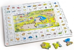 Larsen Puzzle Angolul különösen azok számára, akik szeretik a játékos tanulást. A falu melletti réten vagy a tónál különféle alakokat és tárgyakat fedezhet fel, amelyek szükségesek a kempingezéshez. Az ábécé sorrendben felsorolt angol megnevezésekhez a puzzle szélén képekkel rendelkező darabok illenek.