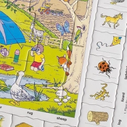 A puzzle közepén 18 klasszikus darab található, amelyek teljes jelenetet ábrázolnak oktató szavakkal és azok angol elnevezéseivel. Minden darab egyedi alakú, így a puzzle csak akkor rakható ki, ha az összes darab a megfelelő helyen van. Erős szegély megkönnyíti az összerakást, és az alján lévő nyílások lehetővé teszik a darabok könnyű eltávolítását.