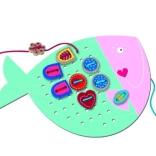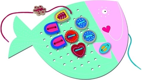 Színes halacska, amely támogatja a gyermekek kreativitását és a cipőfűző helyes kezelését varrás közben.