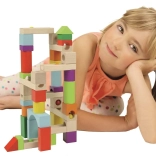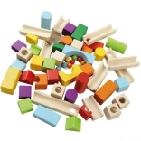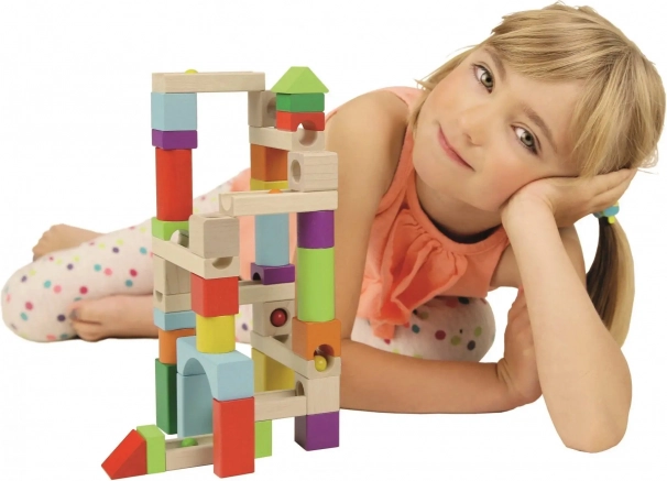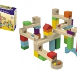 Színes fa blokkok és pályák készlete végtelen lehetőségeket kínál a pálya építésére, miközben finommotorikát és kreativitást fejleszt.
