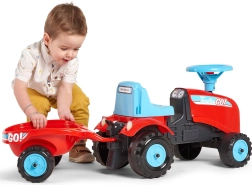 A traktor 12 hónapos kortól ajánlott, 25 kg-ig terhelhető, és készen áll az otthoni vagy kerti használatra. A forgó első tengely megkönnyíti a manőverezést, a minőségi műanyag kerekek pedig sima mozgást biztosítanak különböző felületeken. A csomagban található két matrica szett segítségével egyedi megjelenés alakítható ki – akár vidám arc is a frontrészen.